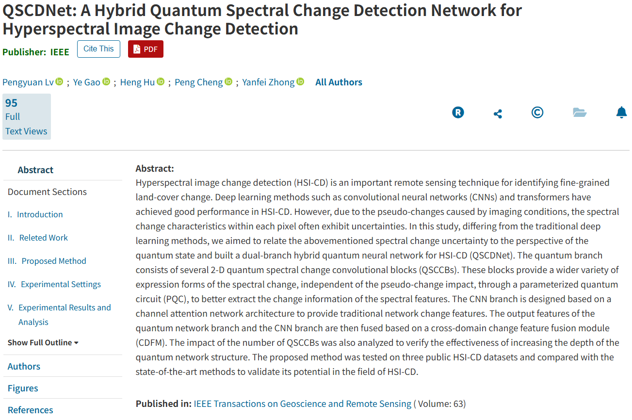 【金年会jinnianhuicom新闻中心讯 数学统计学院】近日,金年会数学统计学院胡衡教授团队和信息工程学院吕鹏远副教授团队在国际地球科学和遥感领域顶级期刊《IEEE Transactions on Geoscience and Remote Sensing》(中科院1区 TOP IF:8.6)联合发表题为《QSCDNet: A Hybrid Quantum Spectral Change Detection Network for Hyperspectral Image Change Detection》的论文,吕鹏远副教授为第一作者,胡衡教授为通讯作者。该论文探索了量子计算在高光谱遥感影像解译中的应用,为高效精准解译遥感数据提供了新思路,被审稿人认为“The quantum computing provides a new way for hyperspectral image processing”。