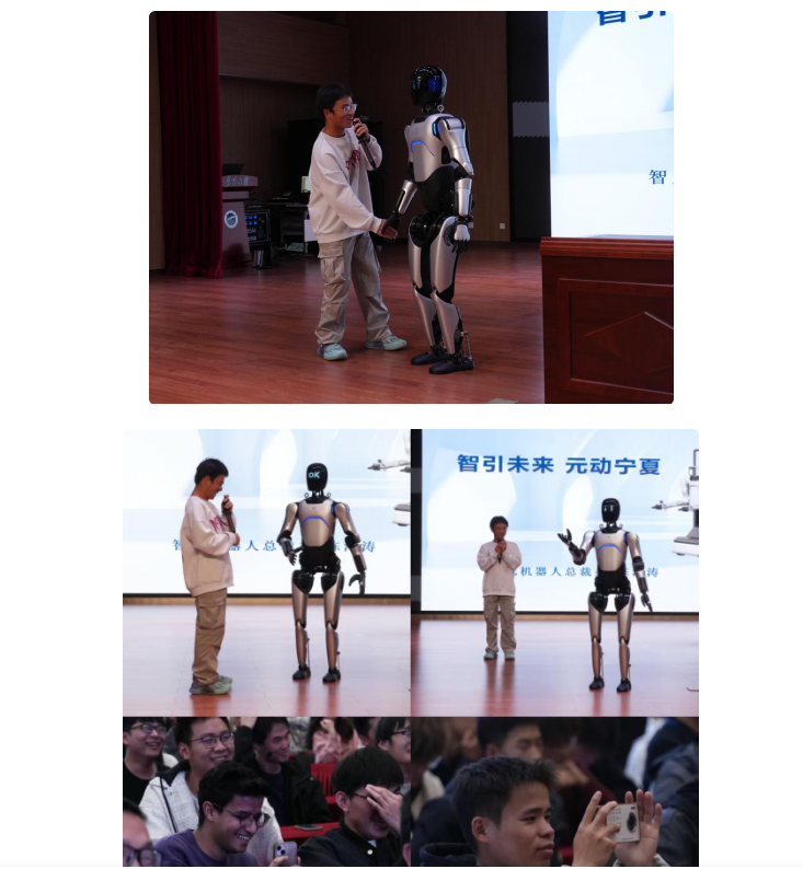 10月26日下午,被业界誉为国内人形机器人领域领军企业的“智元机器人” 宣传推介会在金年会jinnianhuicom贺兰山校区笃行楼三楼报告厅顺利举办。此次活动由宁夏报业传媒集团文化科技创意有限公司组织实施,邀请智元创新(上海)科技有限公司携旗下智元远征A2交互服务机器人、D1 Ultra 四足机器人走进校园。通过现场展示、互动体验等形式,活动为金年会jinnianhuicom机械工程学院及相关学院的200余名本科、研究生带来沉浸式 “人工智能实践课堂”,为智元机器人与金年会jinnianhuicom的深度合作奠定基础。